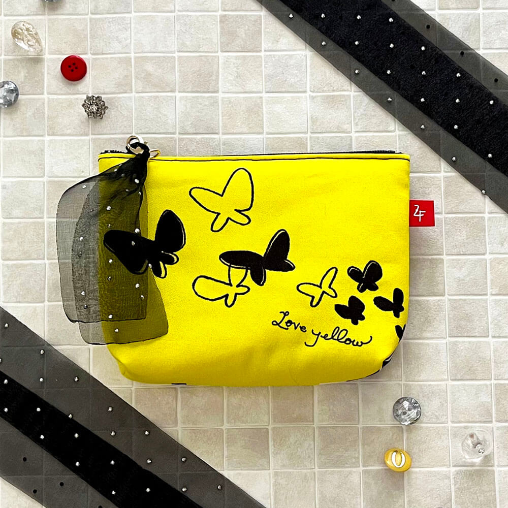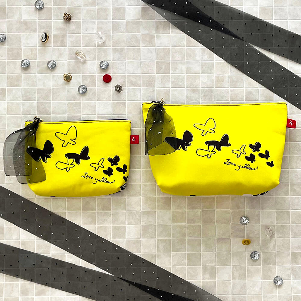 ぱっと目を引く鮮やかな黄色に、ひらひらと舞う蝶をあしらいました。